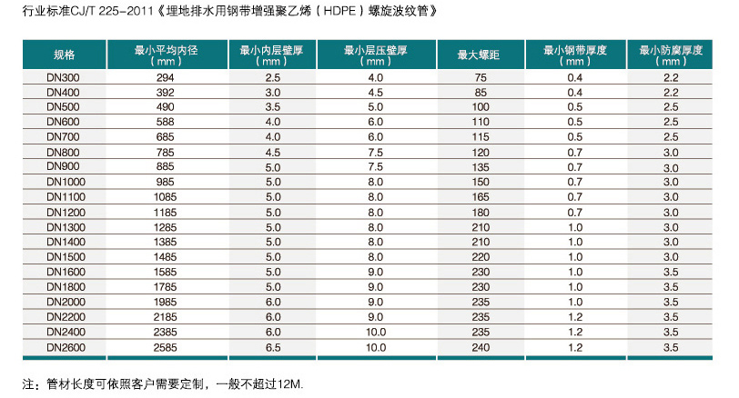 鋼帶增強聚乙烯(HDPE)螺旋波紋管利用鋼帶彈性模量遠遠大于聚乙烯的特點,將鋼帶成型為波形肋并將其黏合到聚乙烯管材的波峰內,波形肋成為管材的增強體,并與聚乙烯復合成為整體,該管道按柔性管的理論(管土共同發揮作用)進行設計。同時在設計狀態下管道垂直方向的變化不得大于管直徑的5%。管材適用溫度范圍:-20℃~45℃(能正常安裝和使用),同時本產品可采用純色,不添加任何帶顏色輔料,確保管材均純原料,增加管材分子結構硬度,確保使用壽命年限,參加抗氧化、抗紫外線、抗老化催化劑,增強聚乙烯管材使用壽命,避免再生原料分子松散老化、脆化、硬化情況發生,大大提升產品質量。該產品解決了鋼帶和聚乙烯層黏合透光問題,管材成型工藝更為科學可靠,是替代水泥管、鋼管的理想管材。